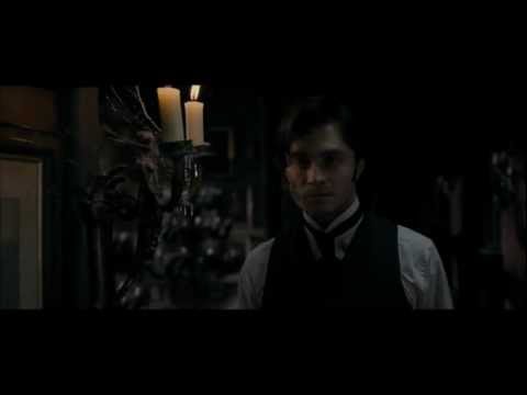 Off screen sound is used throughout most of this clip, the sound of footsteps without a visible source is mysterious and creates tension very effectively in the scene, the audience can feel the tension build up as the footsteps get louder, and once the male character sees the locked door become open the audience can still hear the loud footsteps get closer to the male character which is a good use of non-diagetic sound to create a suspenseful scene. (footsteps from 0:10)
